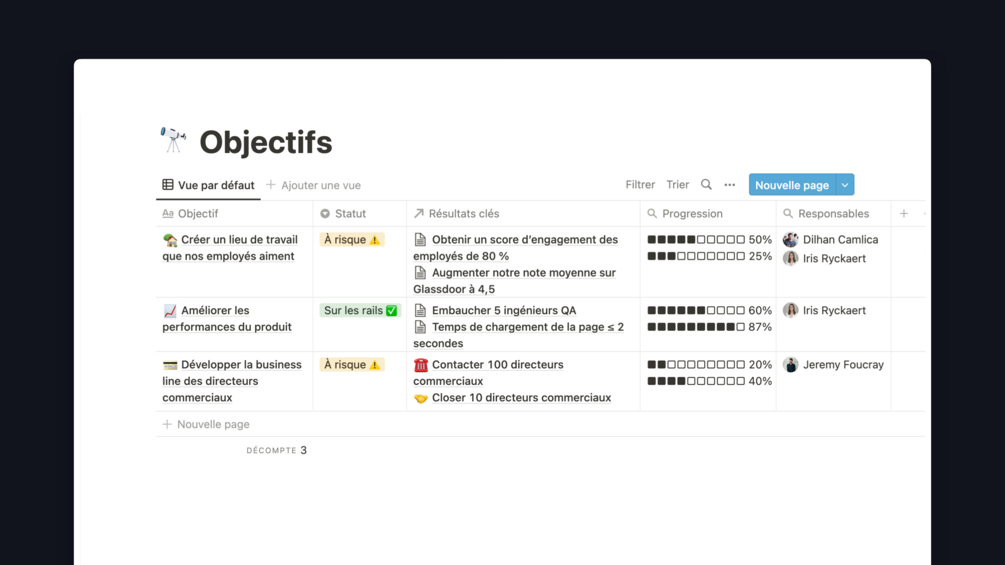 ✅ 3 bases de données pour suivre vos objectifs, résultats clés et actions